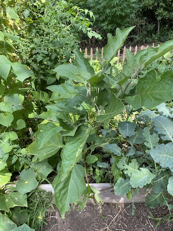 Now my eggplant remains a total mystery, as does broccoli. The eggplant (picture right) has grown huge elephant ear-type leaves, and a dozen blossoms that have looked ready to produce a fruit – but nothing so far. I’m told they need a lot of water, so this heat may be having an adverse effect, even with nightly watering (we have a private well).